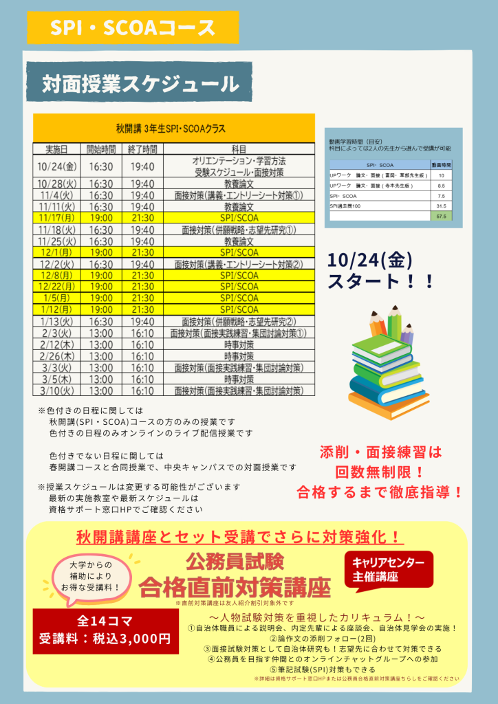 SPI・SCOA+時事対策+人物試験対策を中心に学習を進めていく秋開講(SPI・SCOA)コースの2コースをご準備!