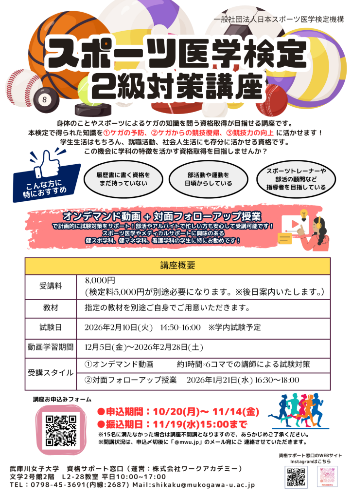 10月20日(月)から11月14日(金)までの期間で、スポーツ医学検定対策講座の申込を募集します。