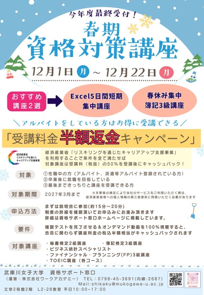 資格サポート窓口では、12/1(月)~12/22(月)まで、春期資格対策講座の申込を受け付けています!