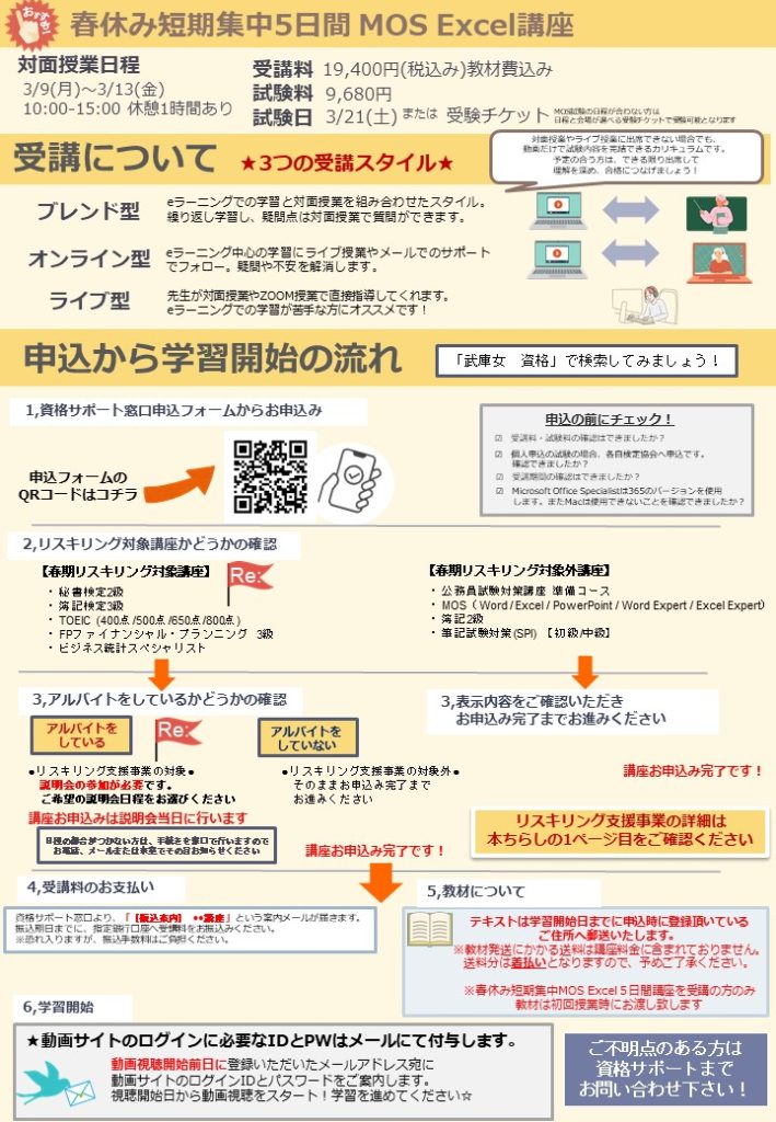 春期講座では、5日間の対面授業で合格を目指すMOS Excel講座や、春休みの2か月で合格を目指す簿記3級講座、オンラインで学べるTOEIC講座など、幅広い講座を開講予定です。