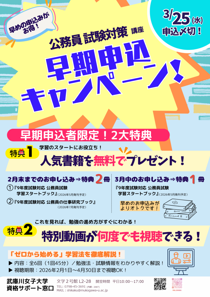 ★特典盛りだくさん★ 2026年度公務員試験対策講座 早期申込受付開始!